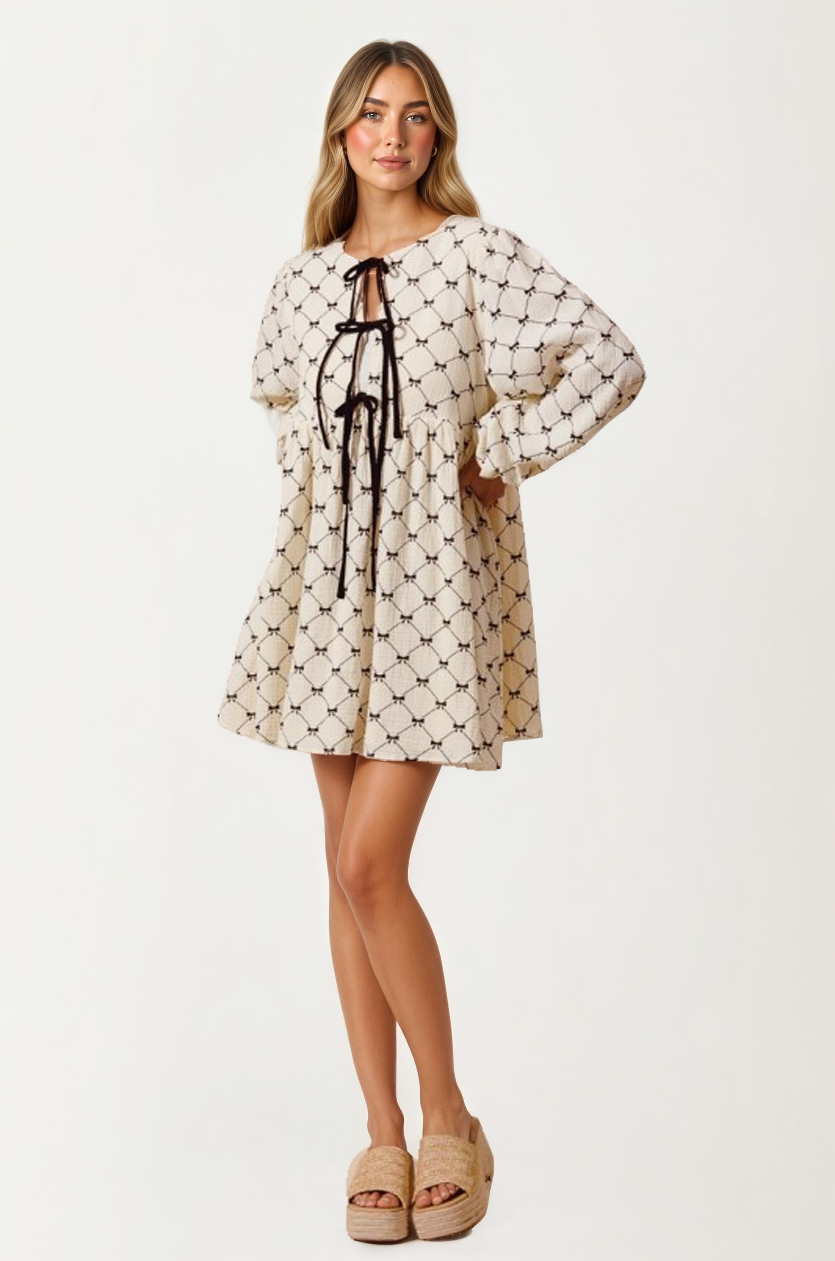 Elevate your everyday charm with this cream-toned mini dress, adorned with a subtle geometric diamond pattern and velvet bow-tie detailing at the neckline. Designed with soft puffed sleeves, an empire waist, and a gently gathered skirt, this silhouette flatters while offering effortless movement. The woven texture and modern proportions give it a whimsical-meets-refined feel. Style it with platform sandals or layered outerwear for transitional flair. An easy yet polished piece from Knit & Lounge’s latest drop.