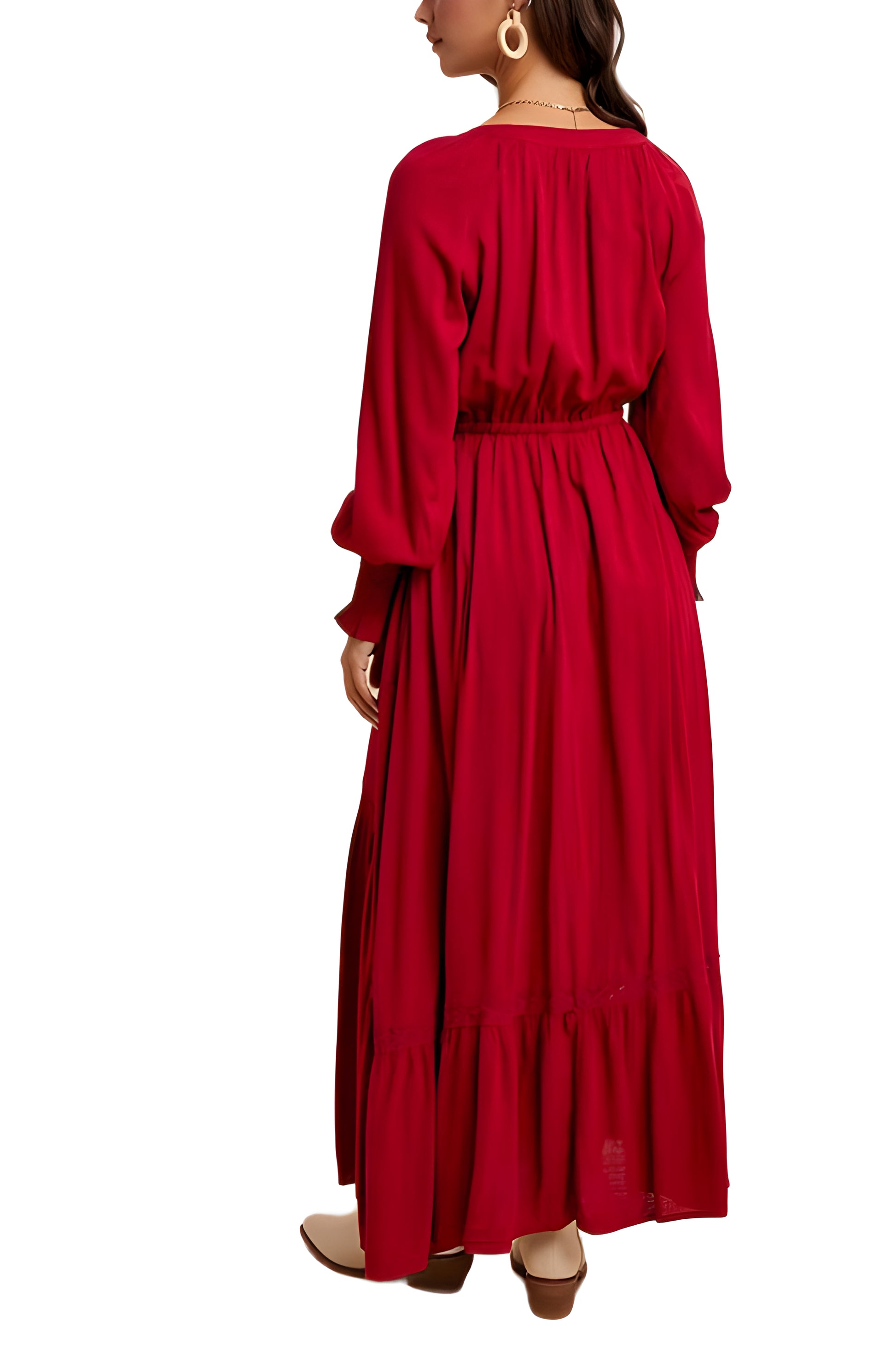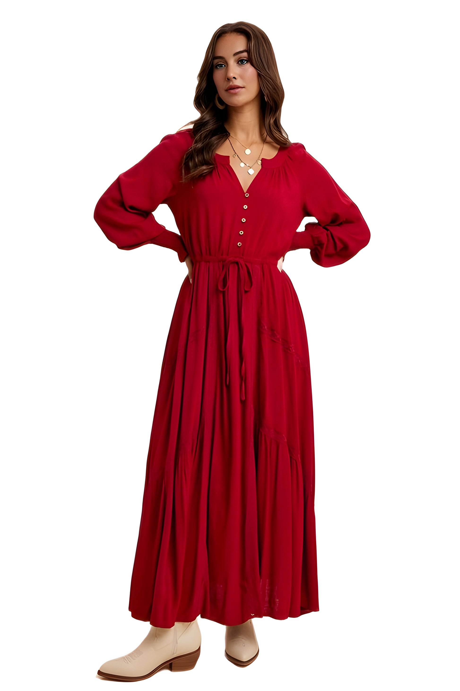 Elegantly relaxed, this red maxi dress brings easy charm with its flowy tiered skirt and soft button-front bodice. Long sleeves with subtle gathering at the wrists add a romantic touch, while the adjustable drawstring waist creates a flattering fit. Crafted in a lightweight fabric, it's the perfect piece to wear from day to night with a quick change of shoes and accessories. Thoughtfully detailed and versatile, it moves gracefully with every step.