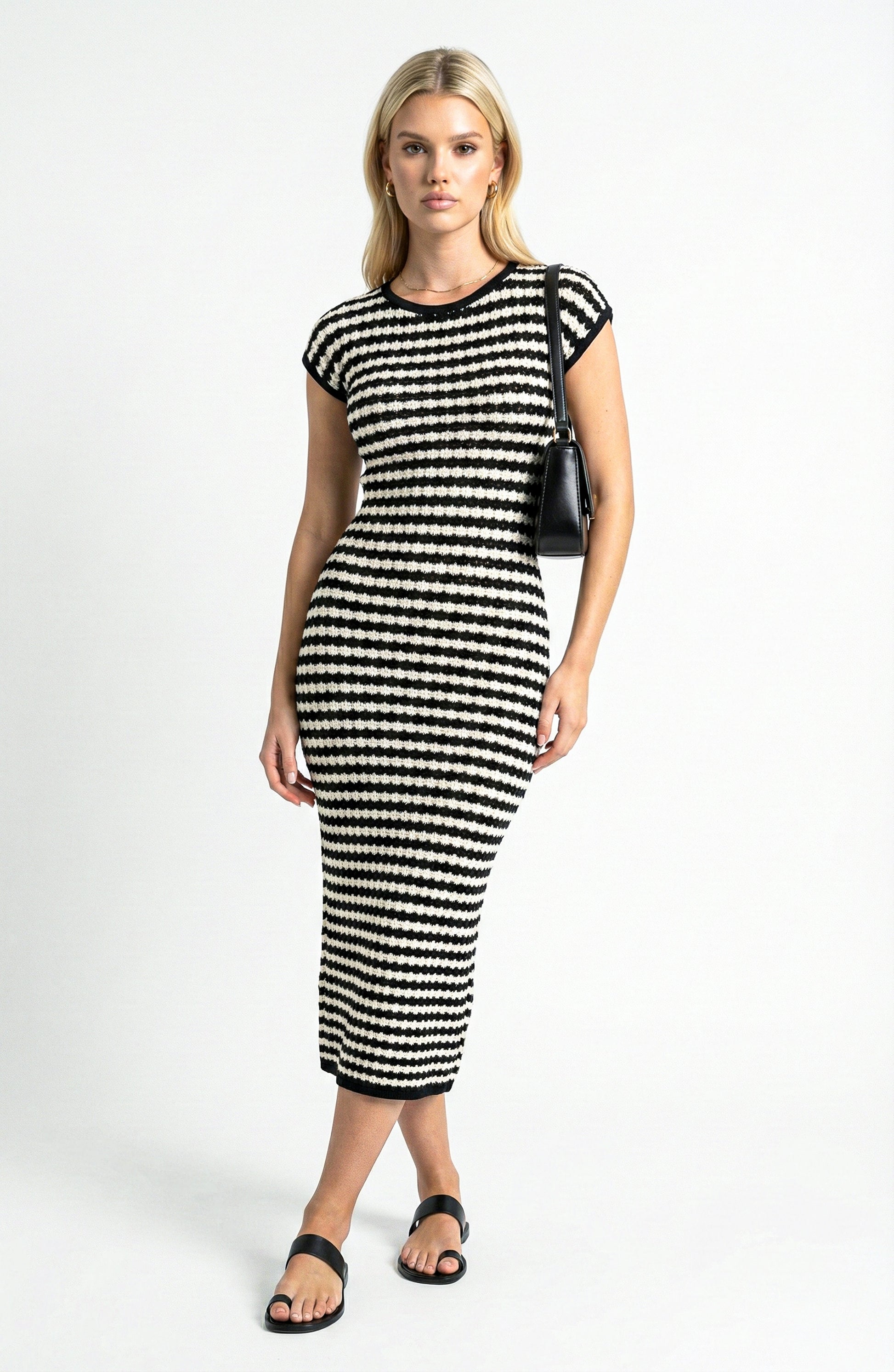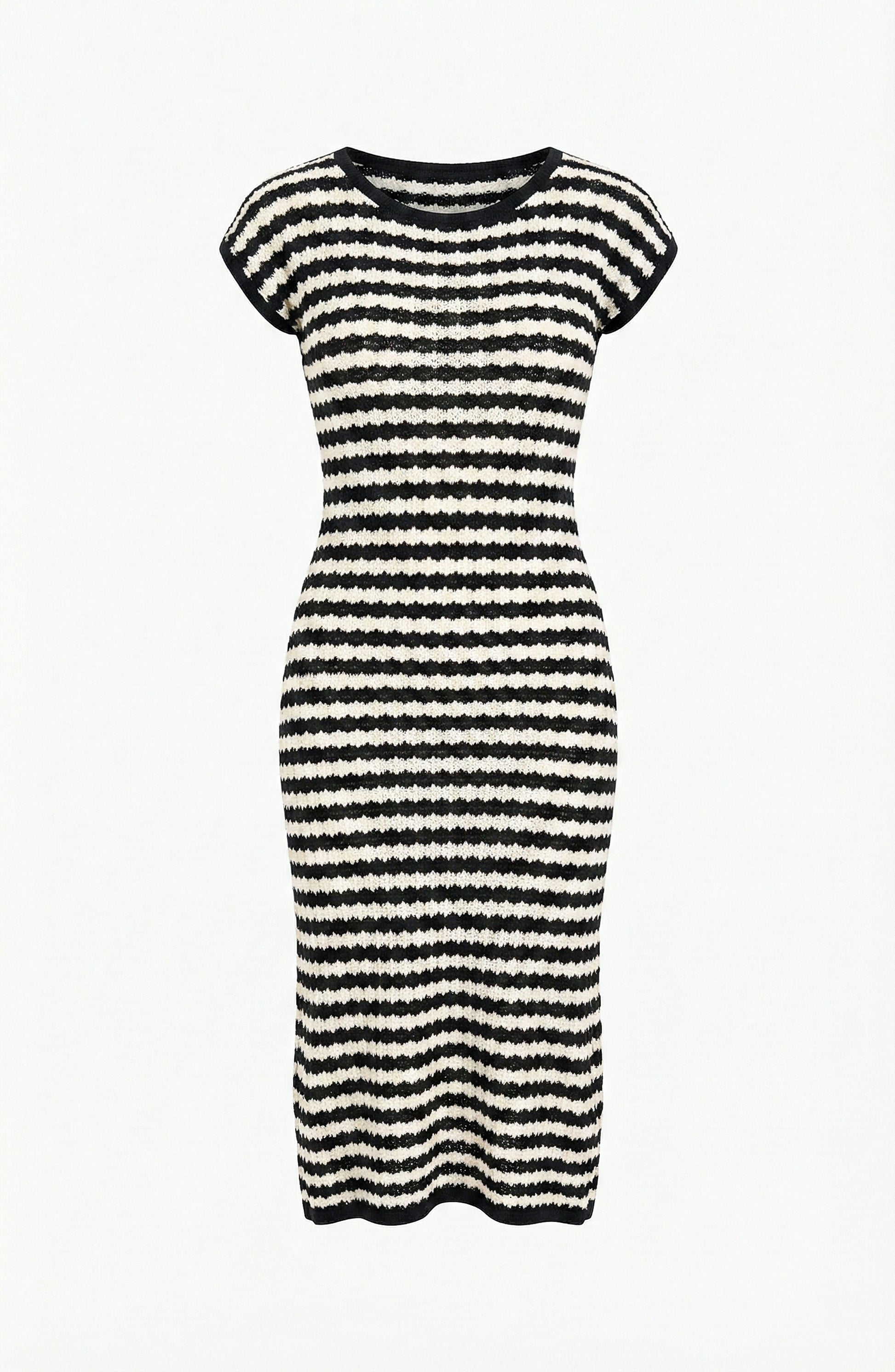- Details: Cap sleeve midi knit dress with crew neckline, horizontal stripe pattern, textured construction, and fitted silhouette designed for versatile styling.