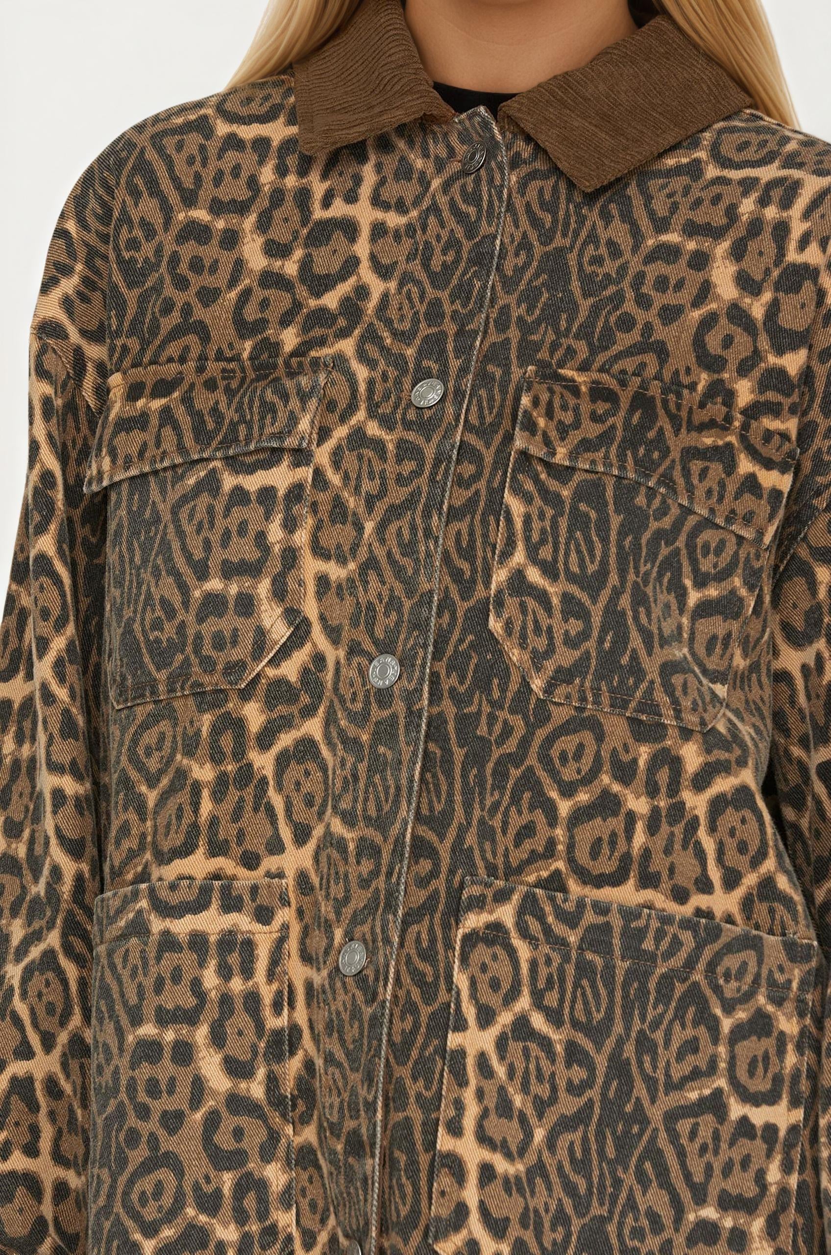 - A relaxed leopard print shacket with button-front closure, oversized pockets, and a contrast corduroy collar, offering versatile layering that blends bold style with everyday comfort.