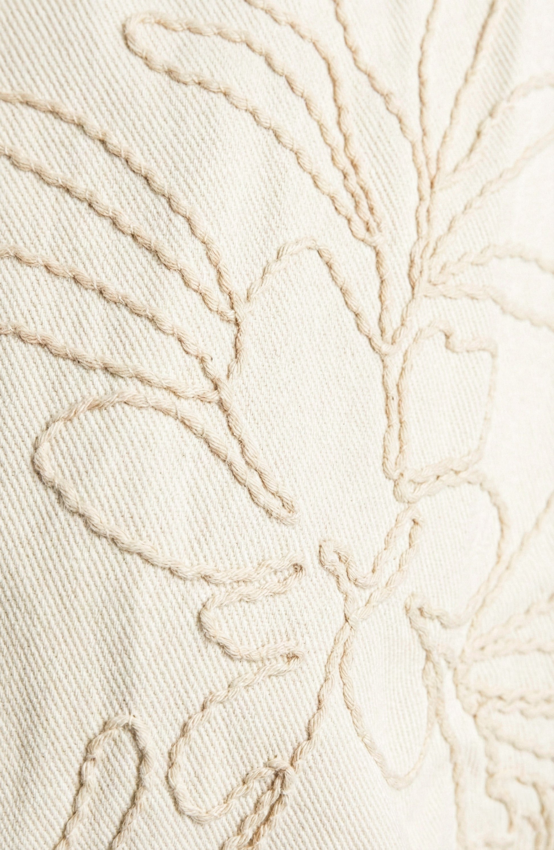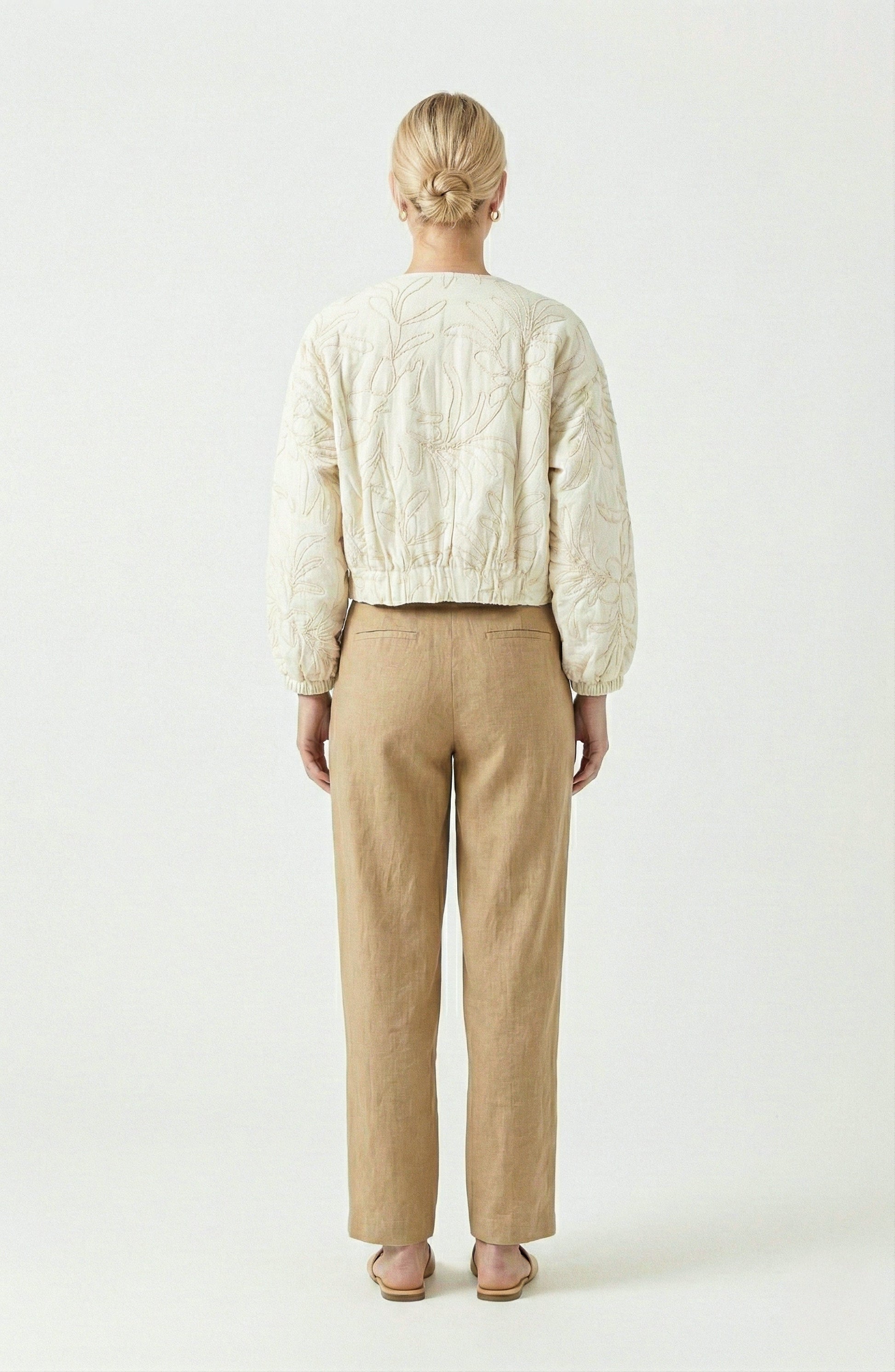 - Details: Long sleeve cropped jacket with round neckline, full zip-front closure, tonal embroidered texture, elasticized cuffs, and structured silhouette designed for everyday layering.