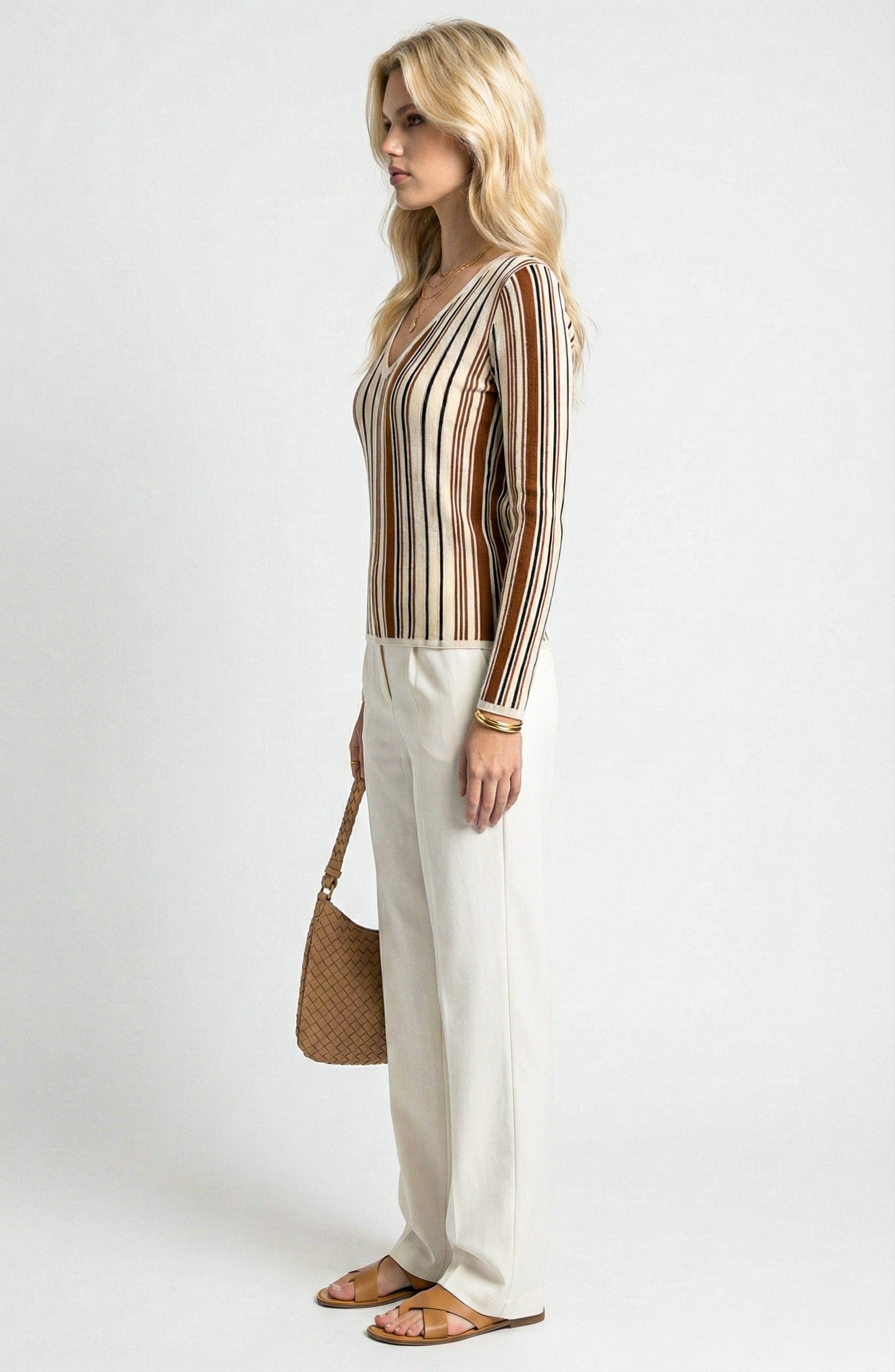 - Details: Long sleeve sweater top with V neckline, vertical stripe pattern, fitted silhouette, and clean hemline designed for everyday styling.