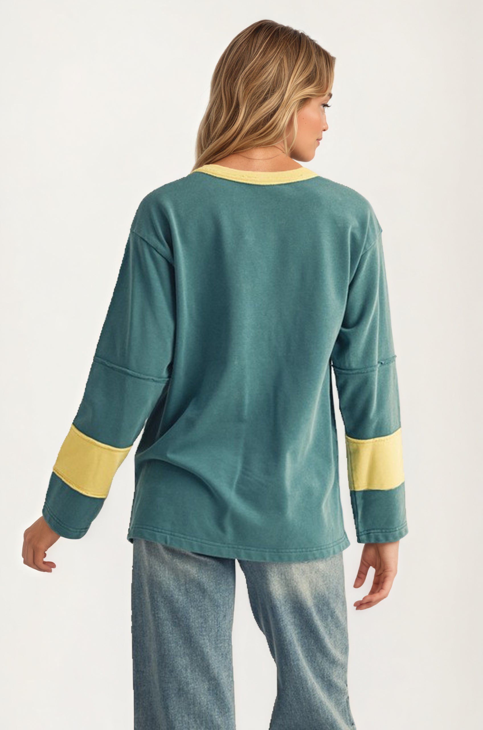 The Knit & Lounge long sleeve top brings a touch of playful charm to your everyday style. Featuring a bold oversized floral applique at the center, this top is crafted with soft, breathable fabric for all-day comfort. Its relaxed fit and dropped shoulders add a casual vibe, while contrast detailing on the sleeves and neckline enhances the design. Perfect for layering or wearing on its own, this versatile top pairs effortlessly with jeans or shorts, making it a standout piece for laid-back days with a touch of personality.