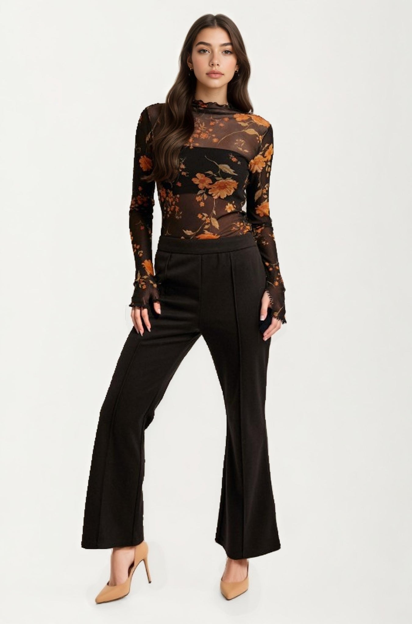 This sheer black mesh top from Knit & Lounge blends elegance and bold style with its delicate burnt orange floral print. Designed with a fitted silhouette and mock neckline, it offers a modern feminine edge that transitions effortlessly from day to night. The lightweight fabric creates a flattering drape, while the long sleeves add coverage without sacrificing breathability. Perfect for layering with bralettes, camis, or under blazers, this top embodies the versatile charm that Knit & Lounge is known for, making it a must-have for your wardrobe.