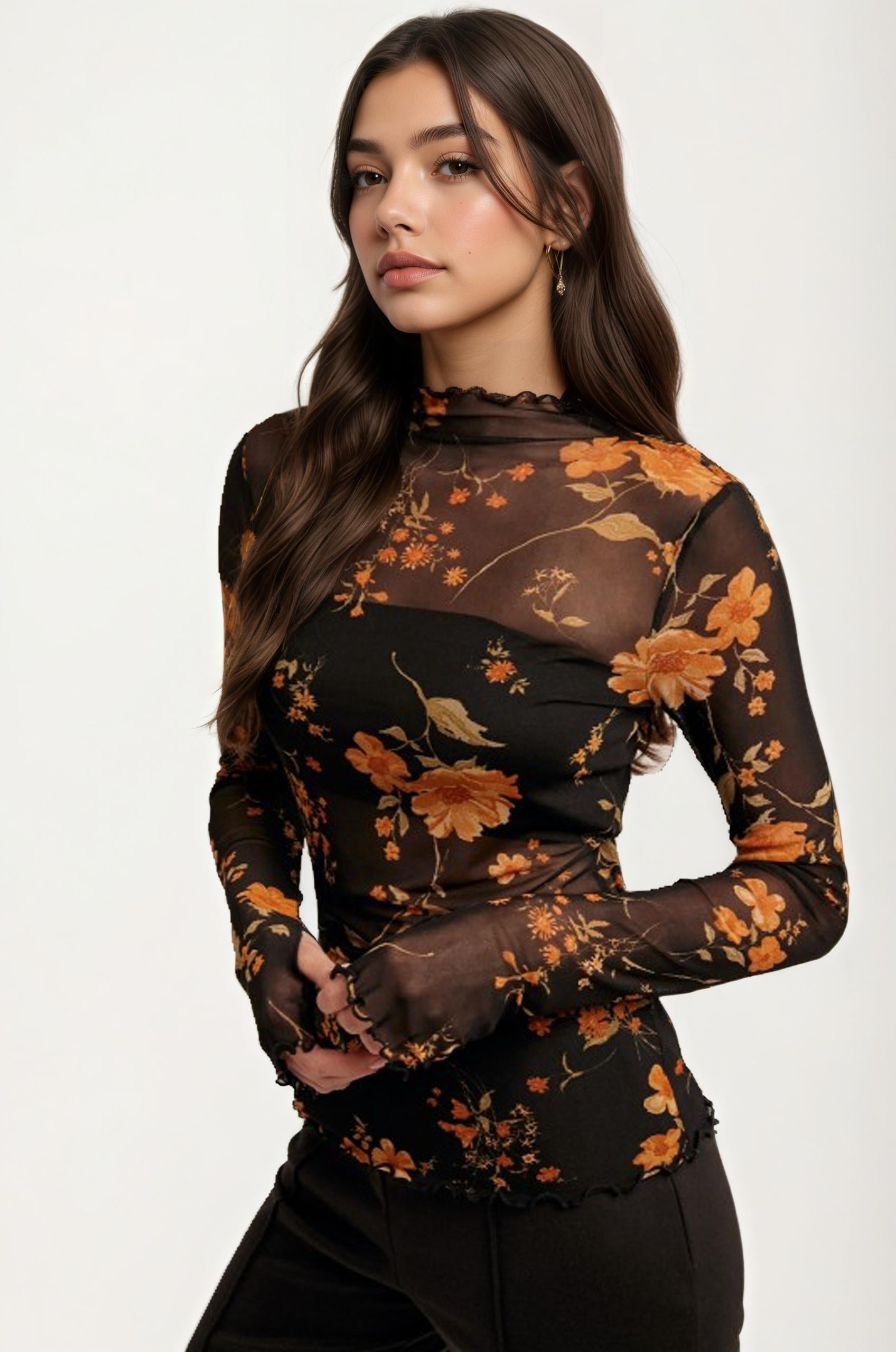 - A sheer mesh long-sleeve top featuring a bold burnt orange floral print, mock neckline, and fitted silhouette, designed by Knit & Lounge for versatile day-to-night styling.