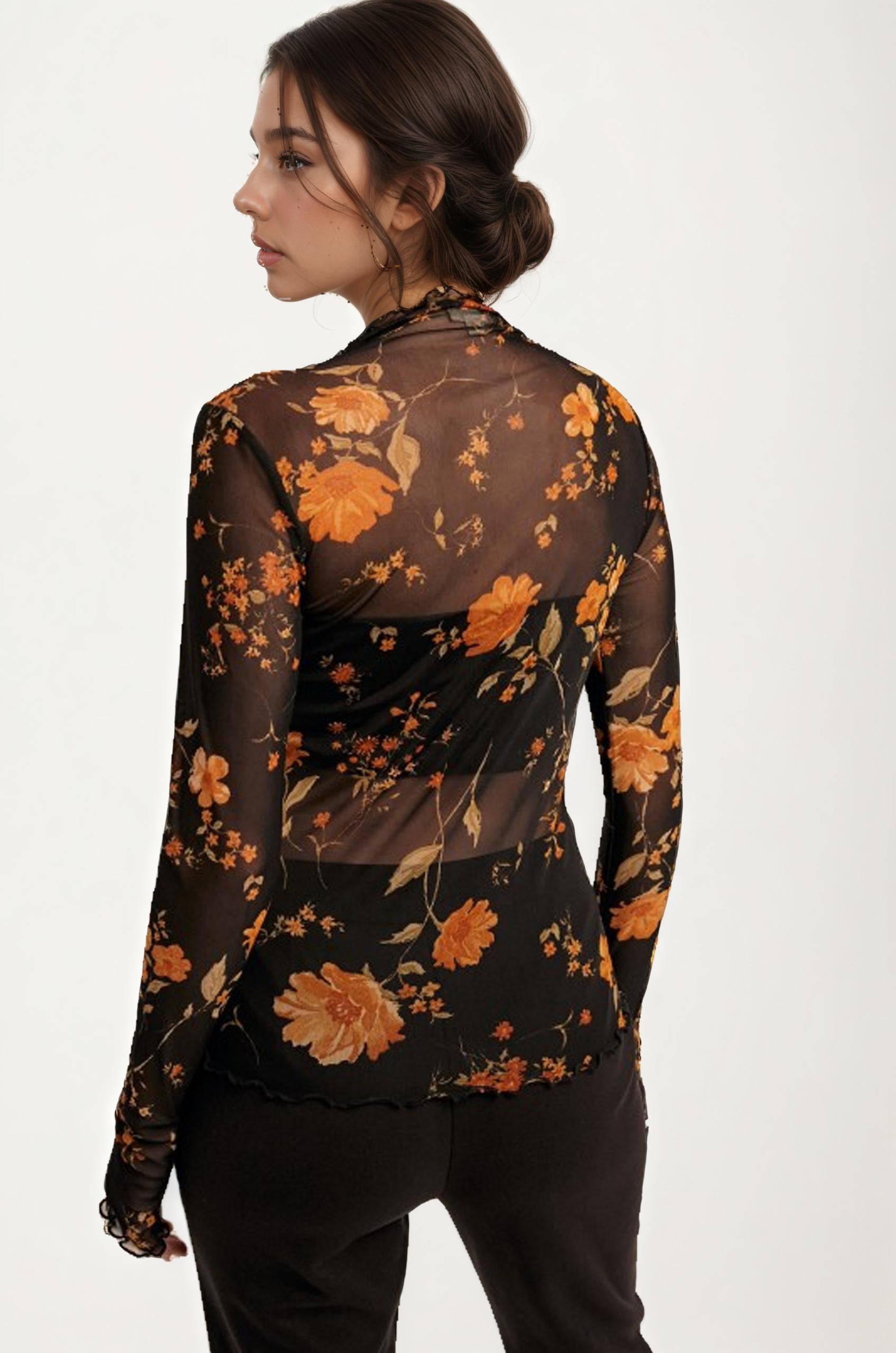 Sheer Black Mesh Top with Burnt Orange Floral Print