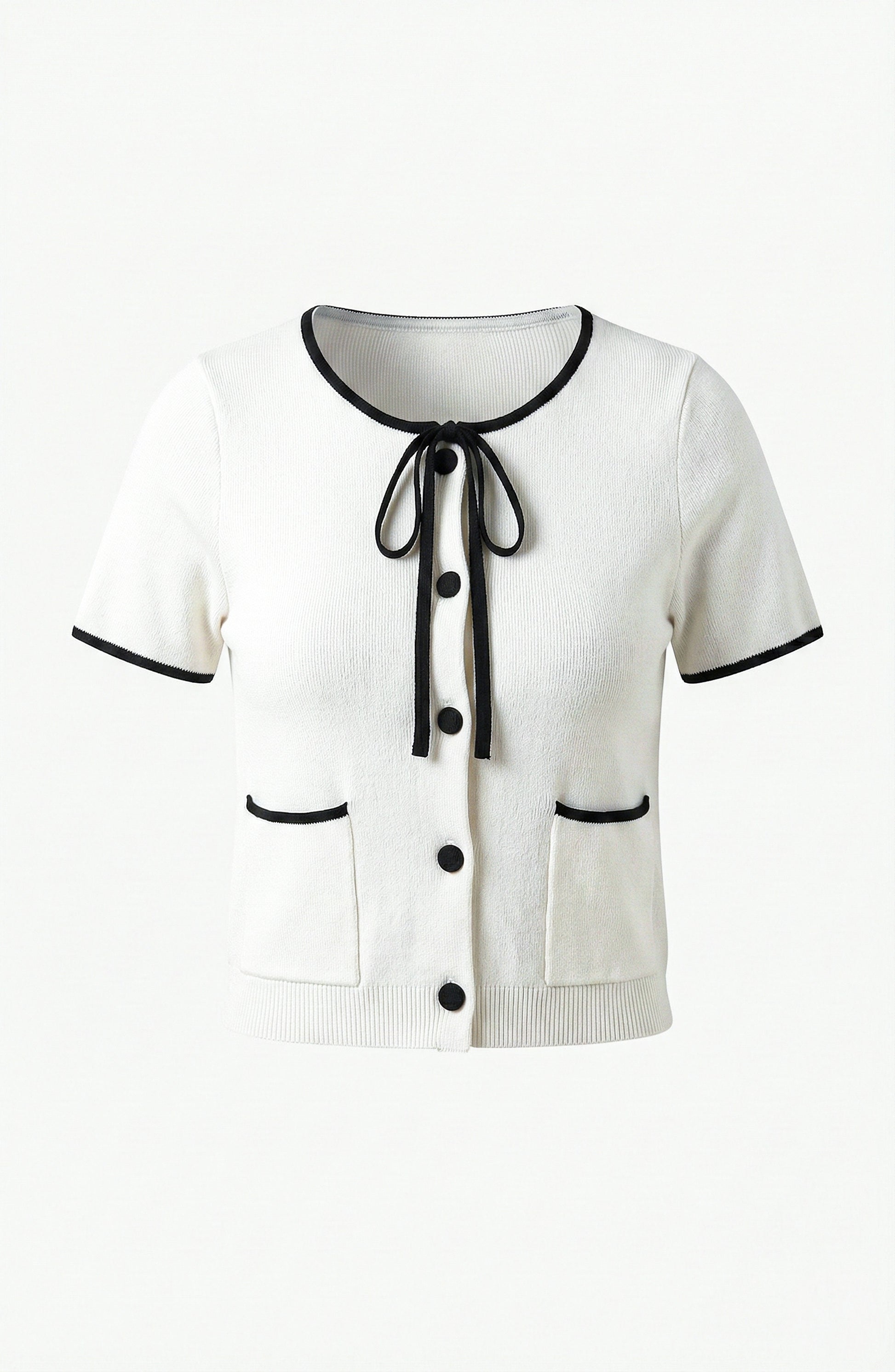 This Knit & Lounge sweater top features a structured silhouette designed with a round neckline and full button-front closure. Contrast trim outlines the placket, neckline, sleeves, and patch pockets, creating a defined profile. The short sleeves provide balanced coverage, while the cropped length allows for clean styling with high-rise bottoms. Crafted in a soft knit construction, this piece offers shape with lightweight structure.