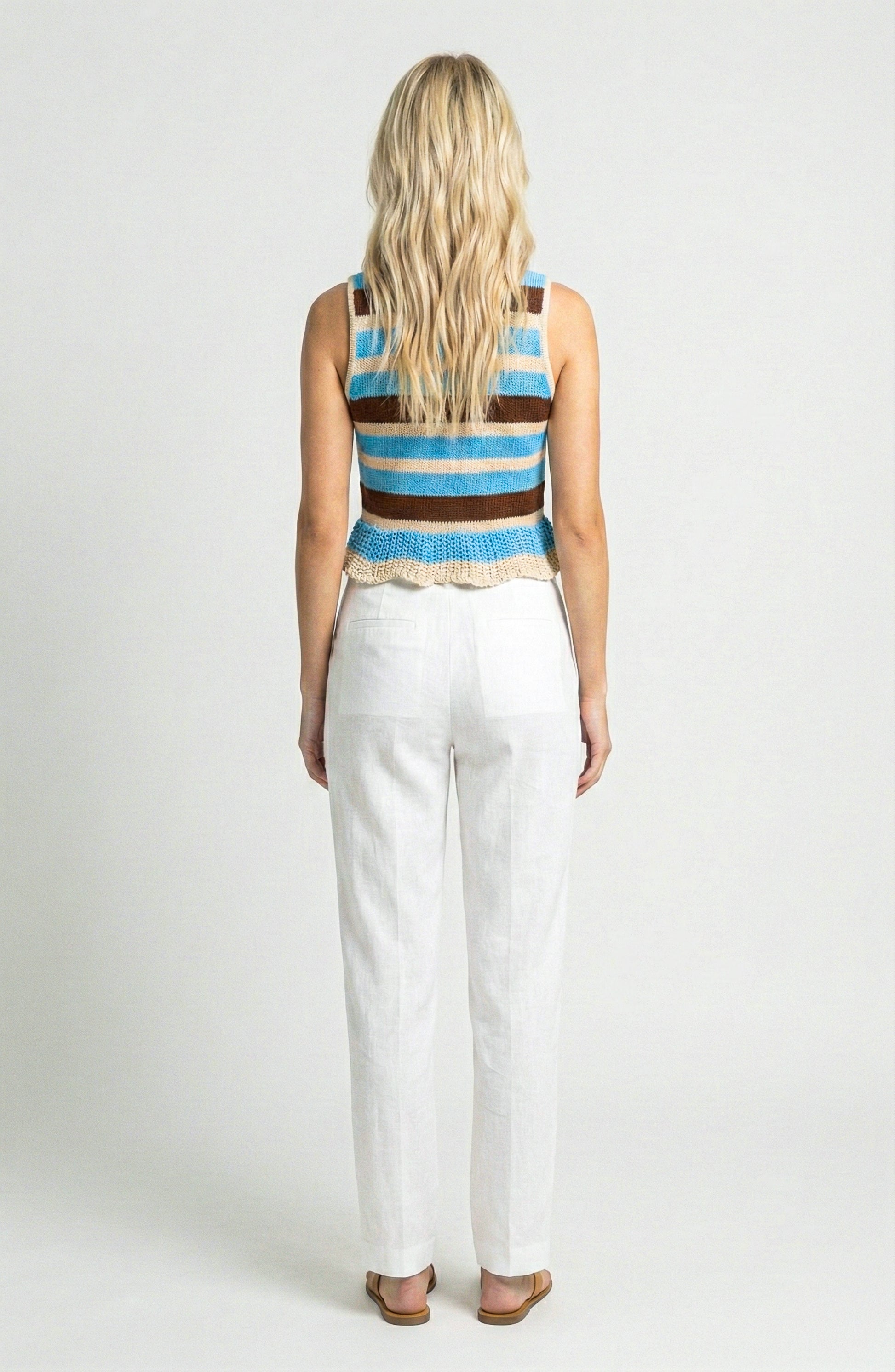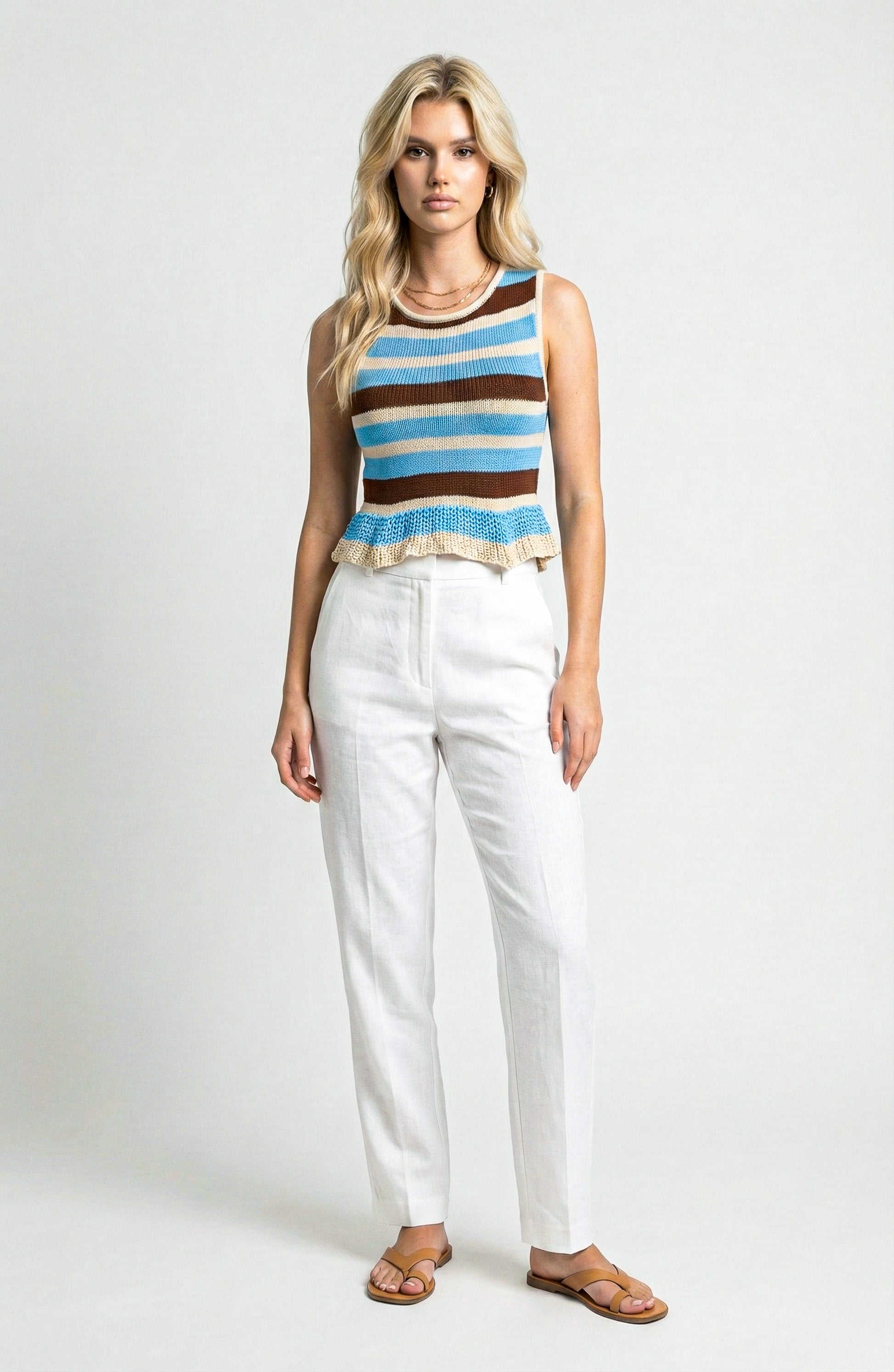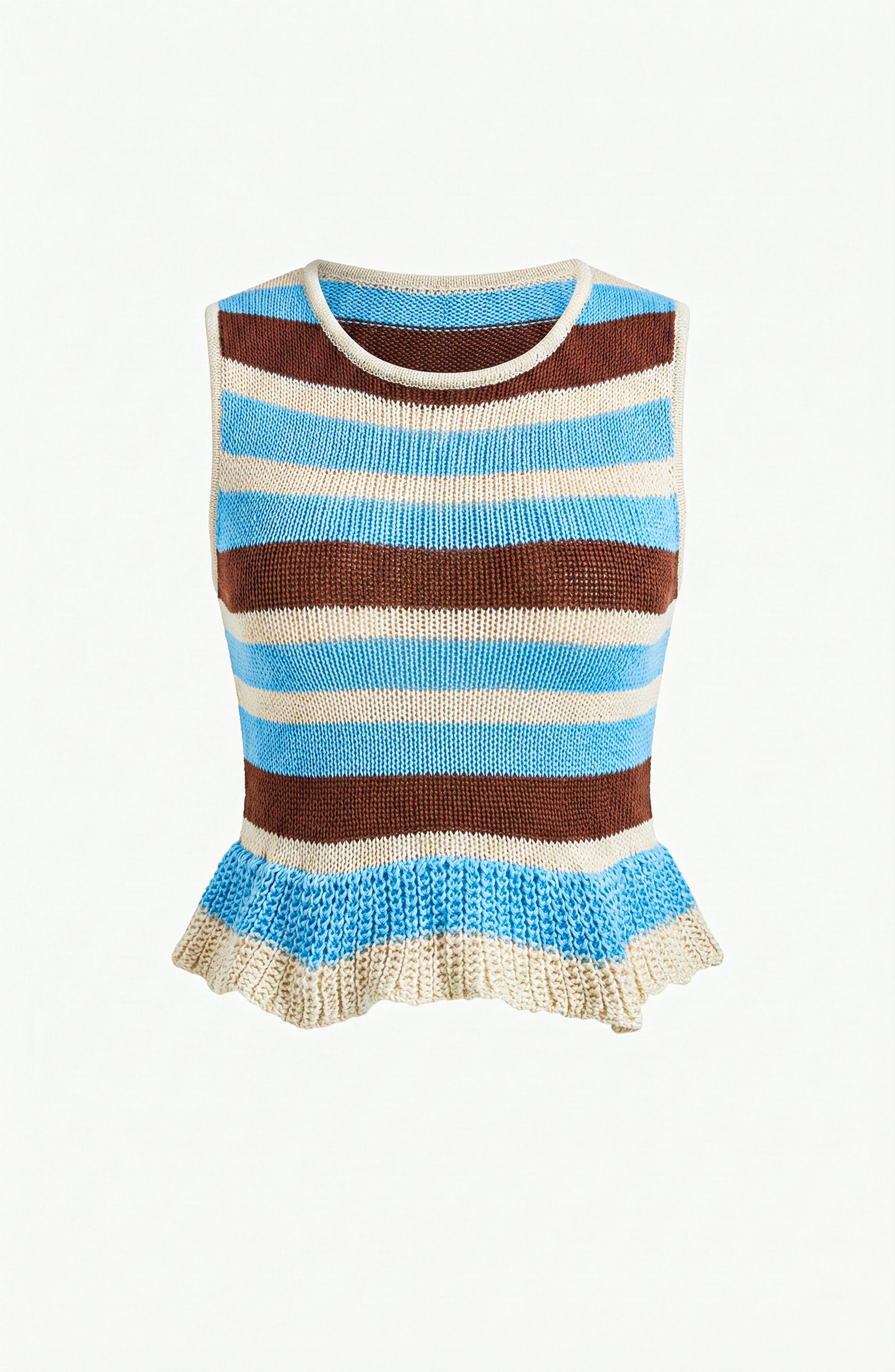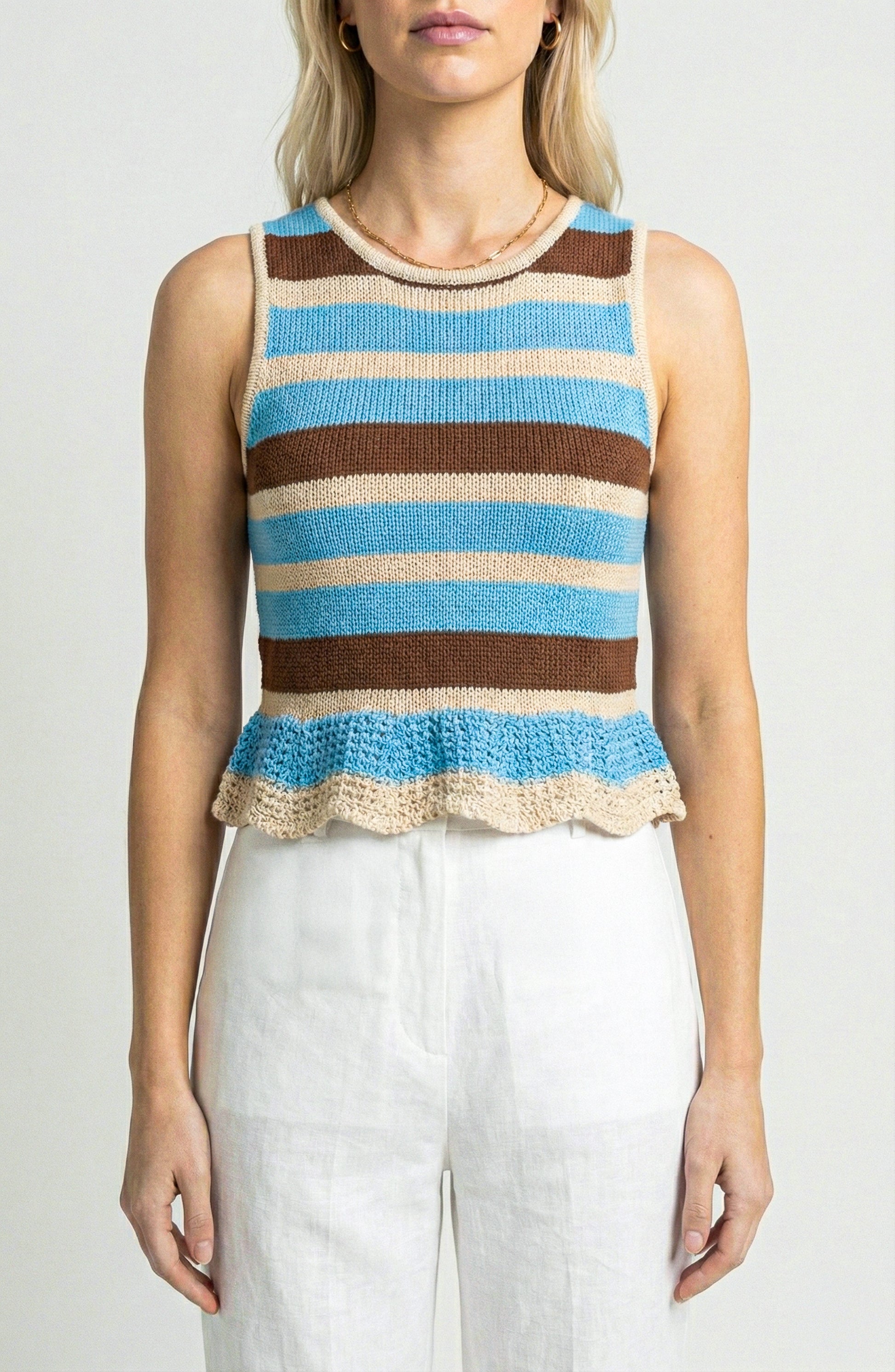- Details: Sleeveless knit top with round neckline, horizontal stripe pattern, textured construction, ruffle hem, and fitted silhouette designed for everyday styling.