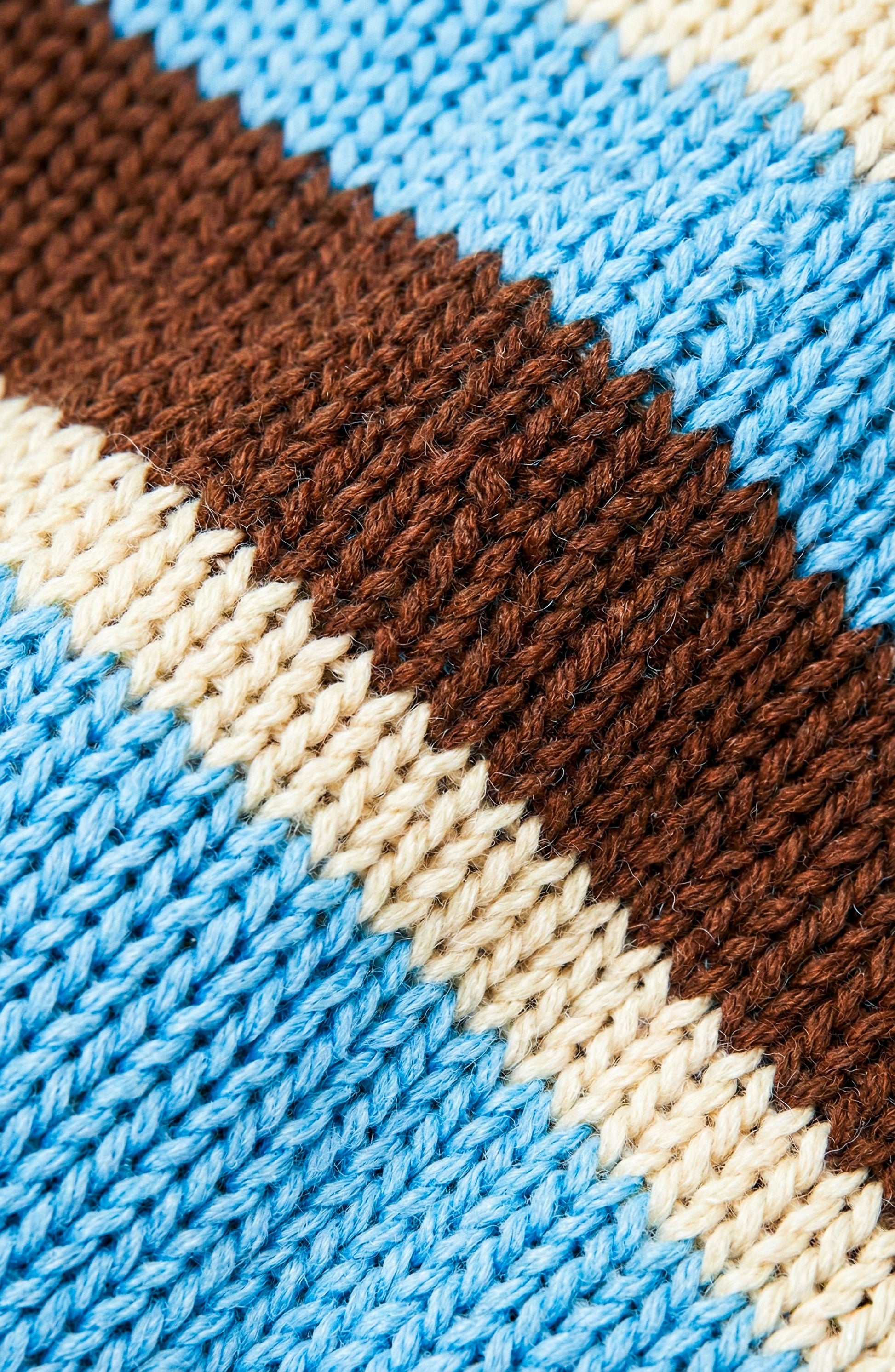 This Knit & Lounge knit top features a fitted sleeveless silhouette designed with a round neckline and horizontal stripe pattern. The textured knit construction provides structure, while the ruffle hem adds dimension and movement to the cropped profile. The clean arm openings and defined waistband create a balanced shape. Designed for warm-weather styling, this piece offers a streamlined yet detailed finish.
