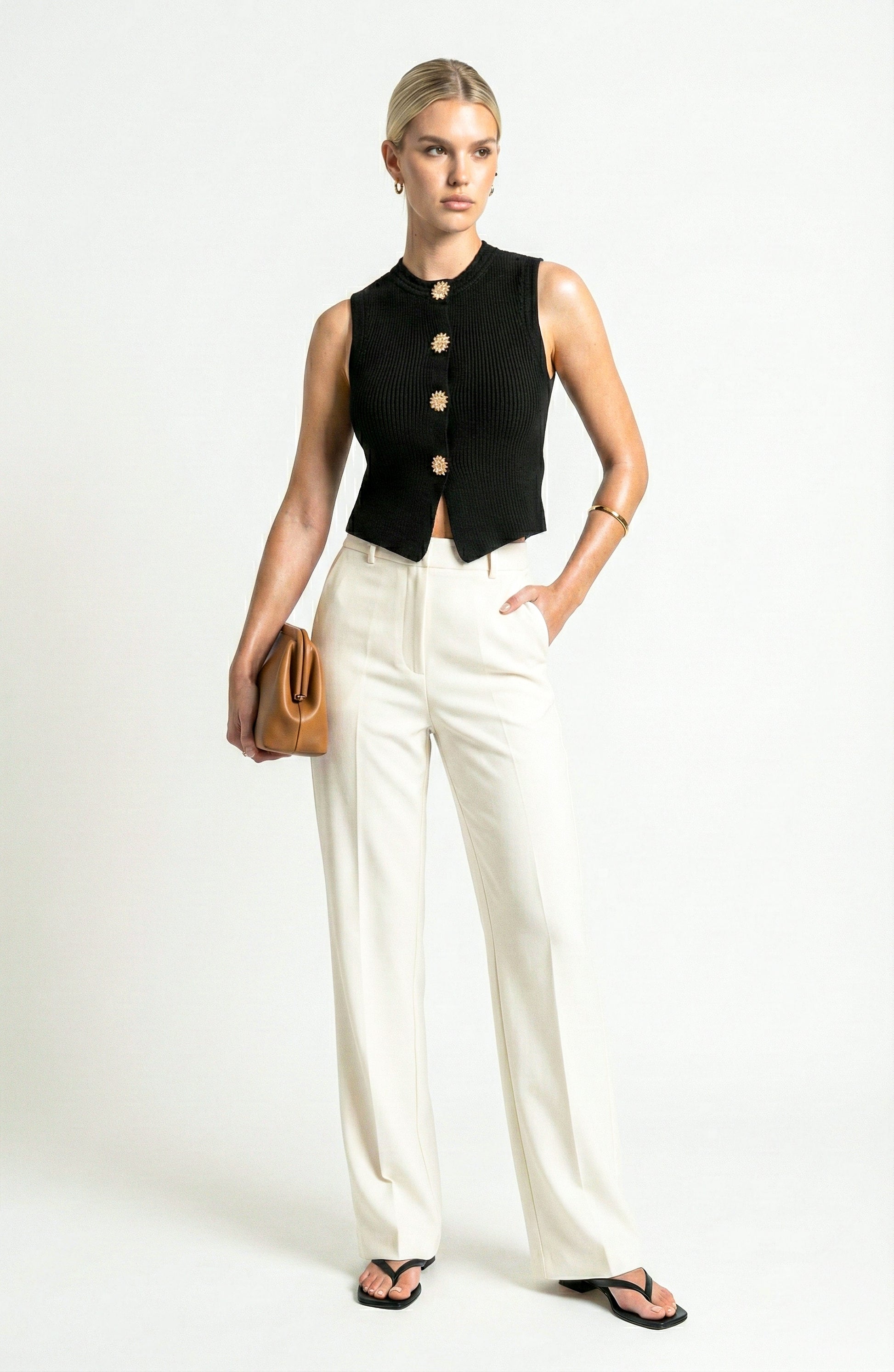 - Details: Sleeveless ribbed knit vest with round neckline, button-front closure, angled hem, and fitted silhouette designed for versatile styling