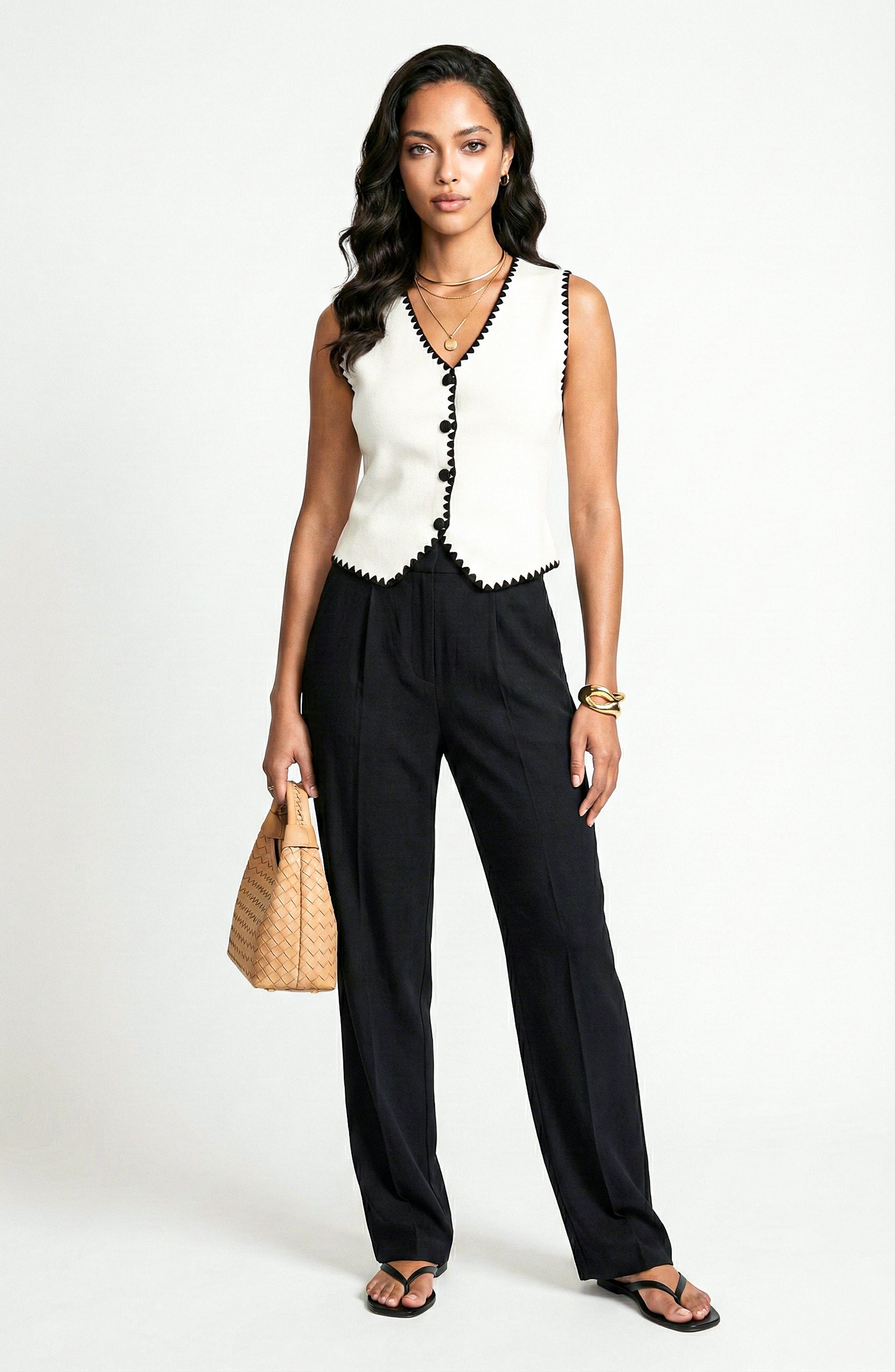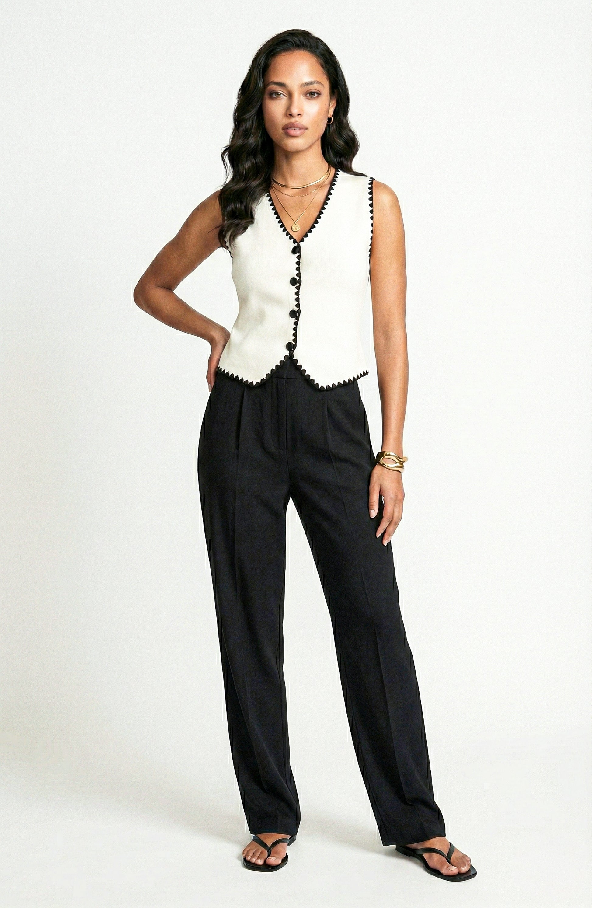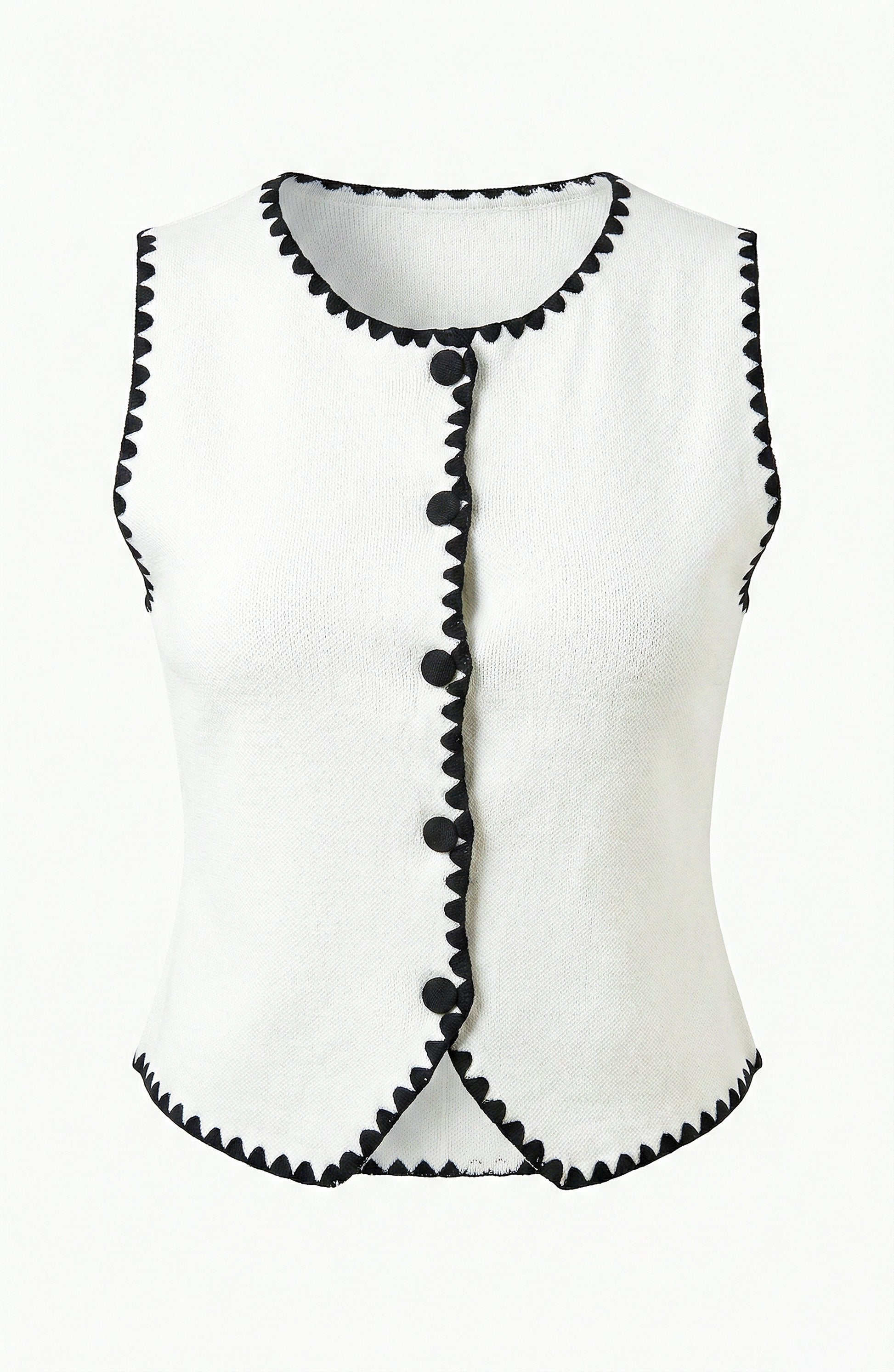 - Details: Sleeveless sweater vest with V neckline, full button-front closure, contrast trim, and structured silhouette designed for versatile styling.