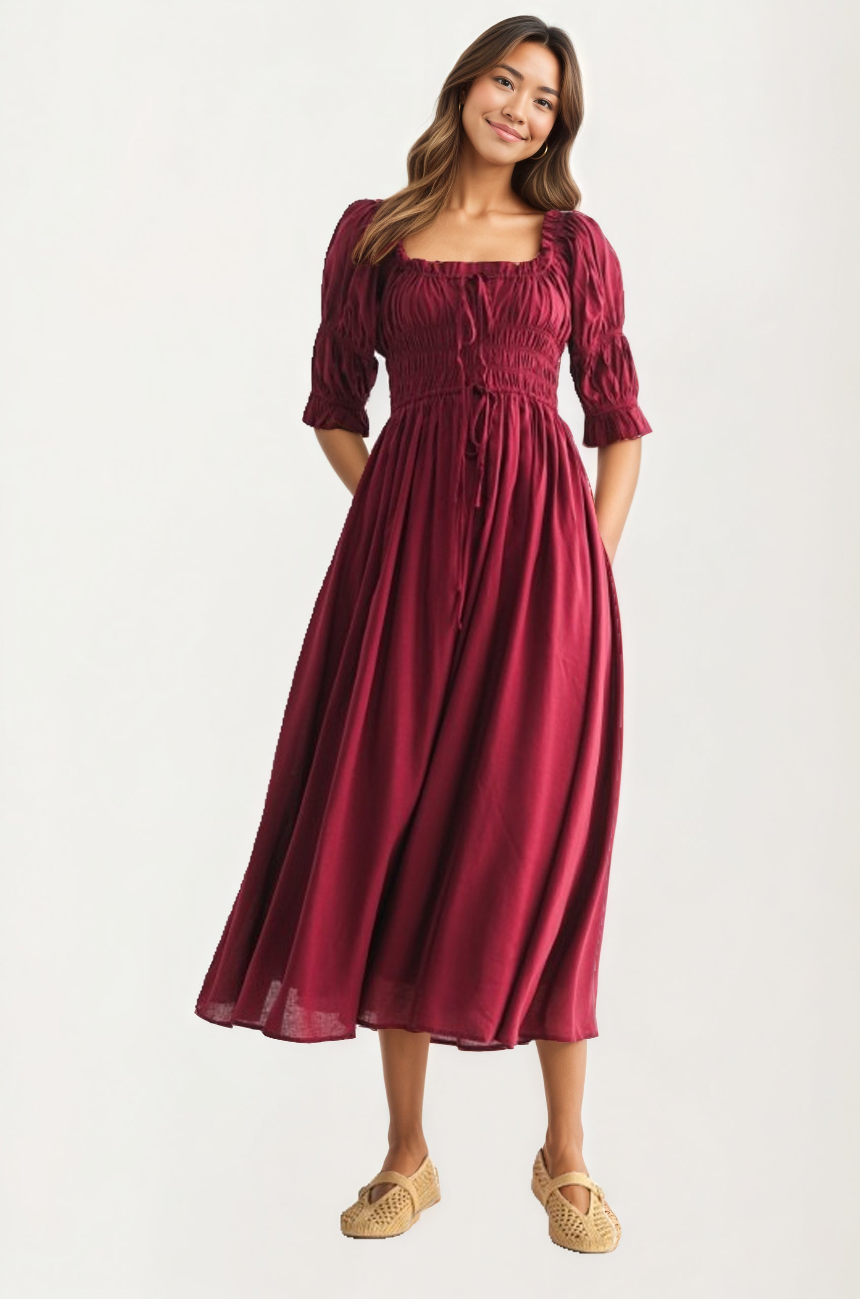 - Smocked bodice maxi dress with puff sleeves, square neckline, tie detail, and flowing skirt that blends comfort and elegance for versatile styling.
