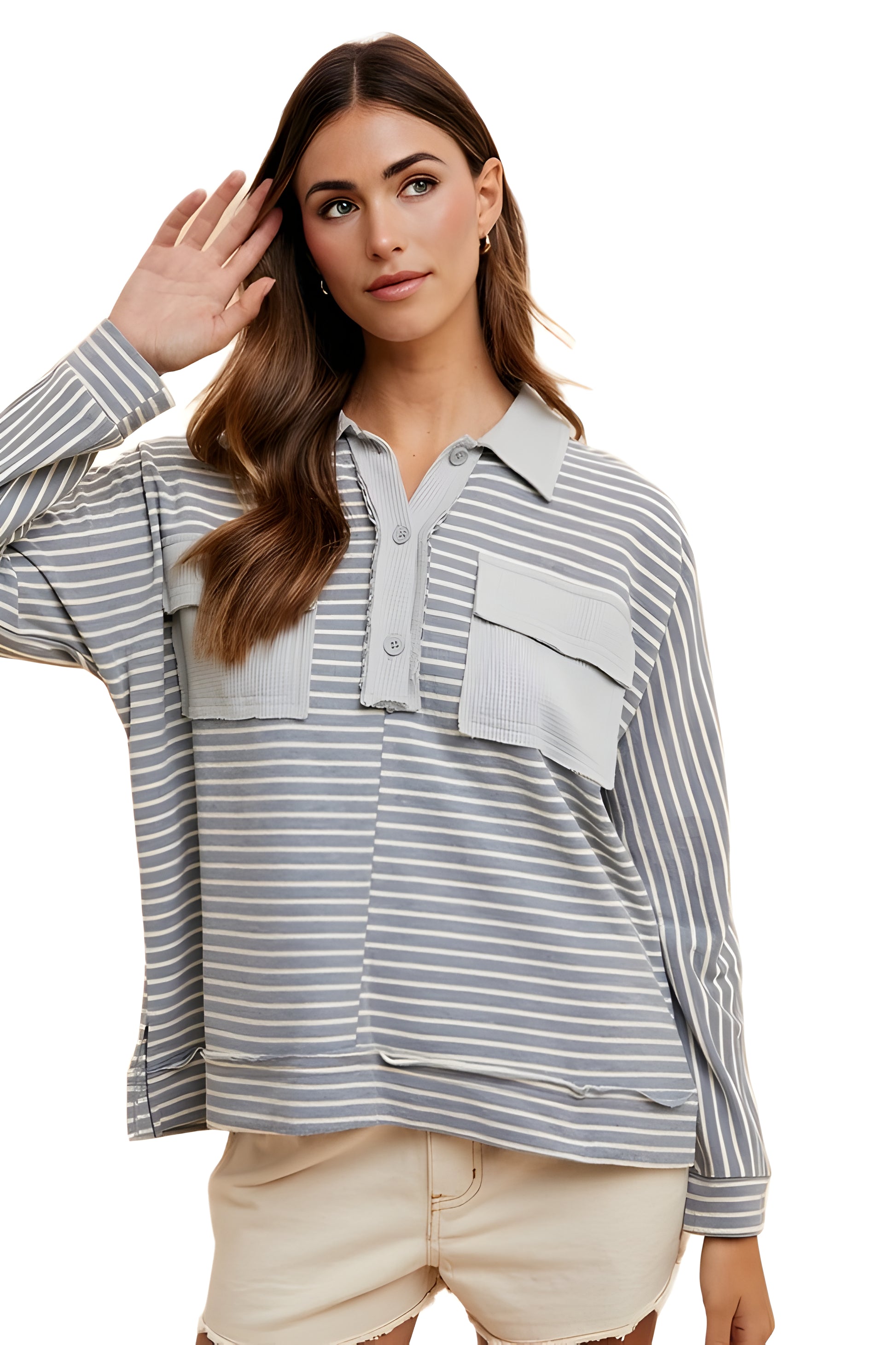 - Designed with a blend of classic stripes and contrast textures, this relaxed-fit top features drop shoulders, button placket, and front pockets for utility-inspired charm.